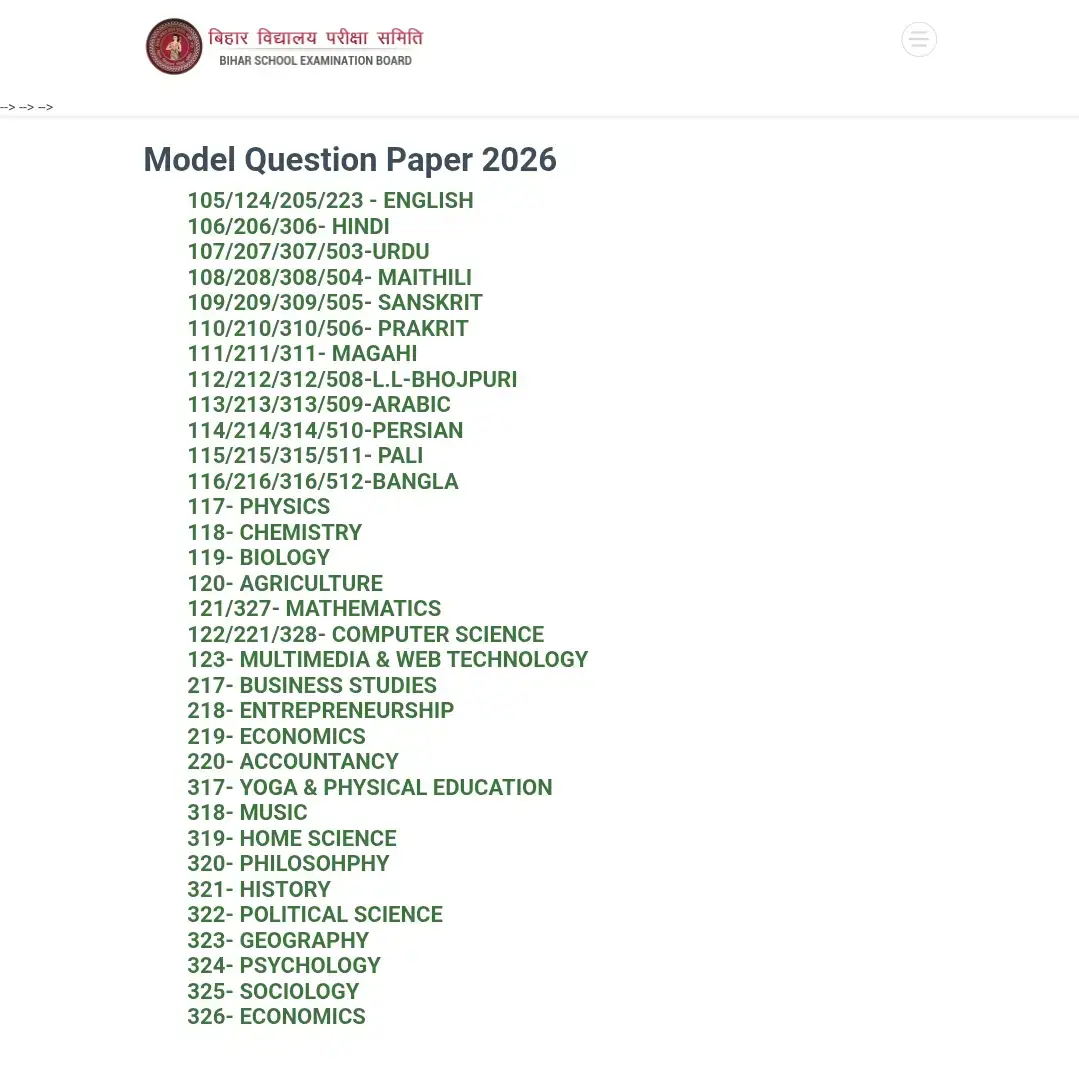 जैसा कि आप सभी जानते हैं कि बिहार परीक्षा समिति के तरफ से हर वर्ष इंटर का परीक्षा देने छात्रों के लिए मॉडल पेपर या फिर सैंपल पेपर जारी करता है जिससे कि 2026 में जो छात्र परीक्षा देंगे इंटर का उनको इस मॉडल पेपर से पढ़ने में आसानी हो और वह अपना परीक्षा आसानी दे सकते है इस मॉडल पेपर को डाउनलोड करके छात्र पढ़ सके और अपना परीक्षा में अच्छे नंबर से पास करे इसलिए इस मॉडल पेपर को जारी किया जाता है और इसी मॉडल पेपर से बिहार बोर्ड एग्जाम के सवाल भी पूछती है लगभग । हर वर्ष की तरह इस वर्ष भी बिहार बोर्ड की तरफ से इंटर परीक्षत्थियों के लिए मॉडल पेपर जारी कर दिया गया है आप इसे निचे दिए लिंक से डाउनलोड कर सकते है । Note- नीचे दिए गए लिंक से आप सभी विषयक मॉडल पेपर को डाउनलोड कर सकते हैं। (adsbygoogle = window.adsbygoogle || []).push({});